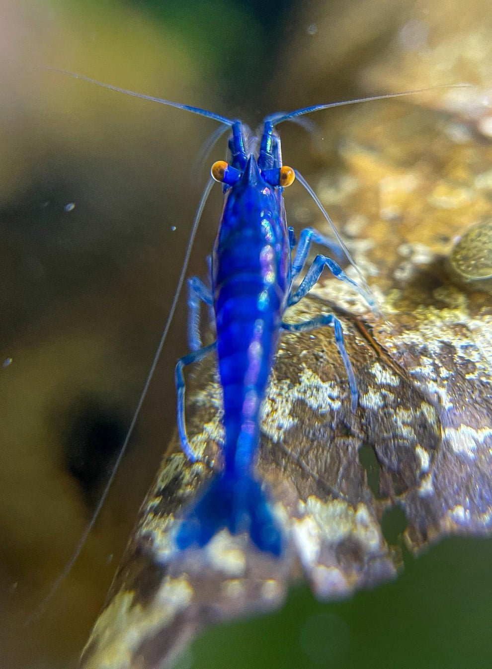 The Orange Eye Blue Demon Shrimp is a stunning new mutation of the popular Blue Dream Shrimp, instantly recognizable by its vivid bright orange eyes contrasted against a shimmering blue body. As a Neocaridina variety, it offers the hardiness and adaptability that both beginners and experienced hobbyists appreciate. First bred by Michael Haesler in Germany, this exciting new addition to the hobby officially debuts in 2025 and is available in extremely limited quantities. It quickly gained attention for its eye-catching combination of brilliant blue hues and intense orange eyes, giving it a “demon-like” look that stands out beautifully in any planted aquarium.